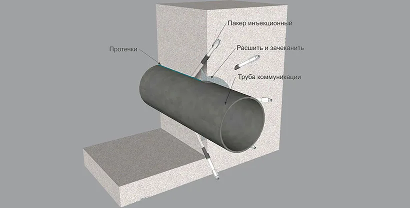 Комбинированный метод: гидропломба «Пенеплаг»/«Ватерплаг», шовный материал «Пенекрит», проникающий состав «Пенетрон», полимерный клей/герметик «ПенеПокси».